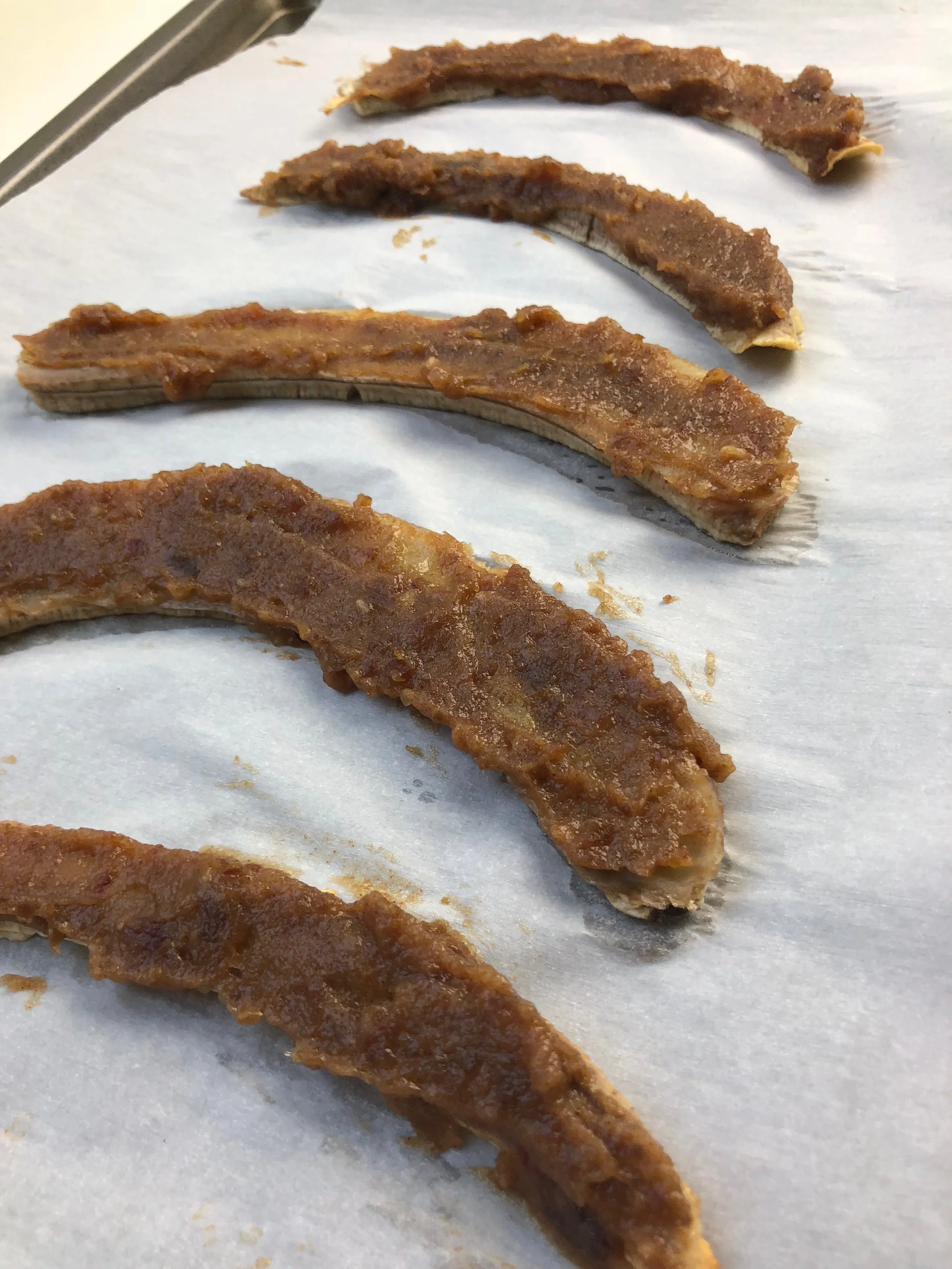 Once the bananas are done, take them out for 15 minutes to cool, then flip them over using a spatula. Coat one side of the banana in the paste.