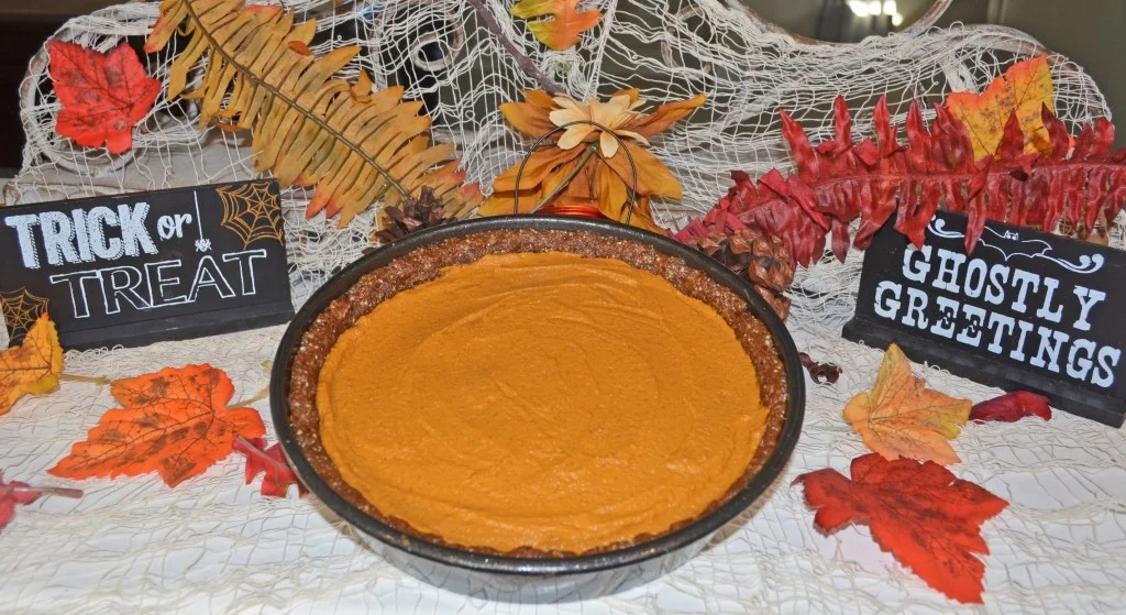 7. Pour your pumpkin pie filling into the pie pan and smooth it out with the back of your spoon.