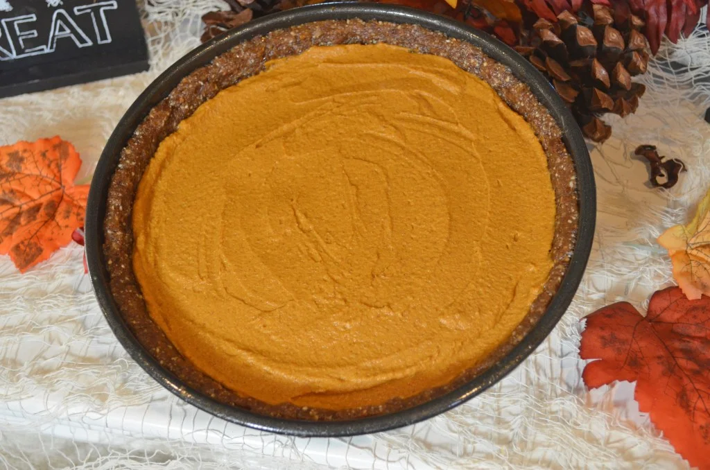 8. Refrigerate your Raw Vegan Pumpkin Pie for a few hours or overnight for the best results. The longer it refrigerates the better it will set. I couldnβt wait that long to eat mine so I refrigerated for 2 hours then stuck it in the freezer for about an hour.