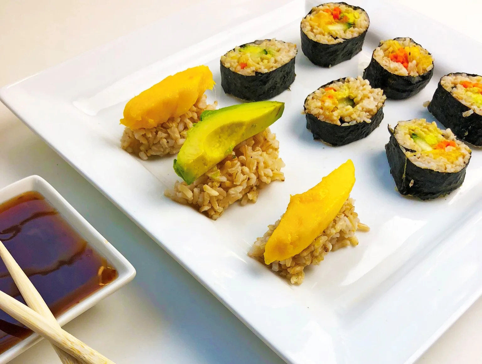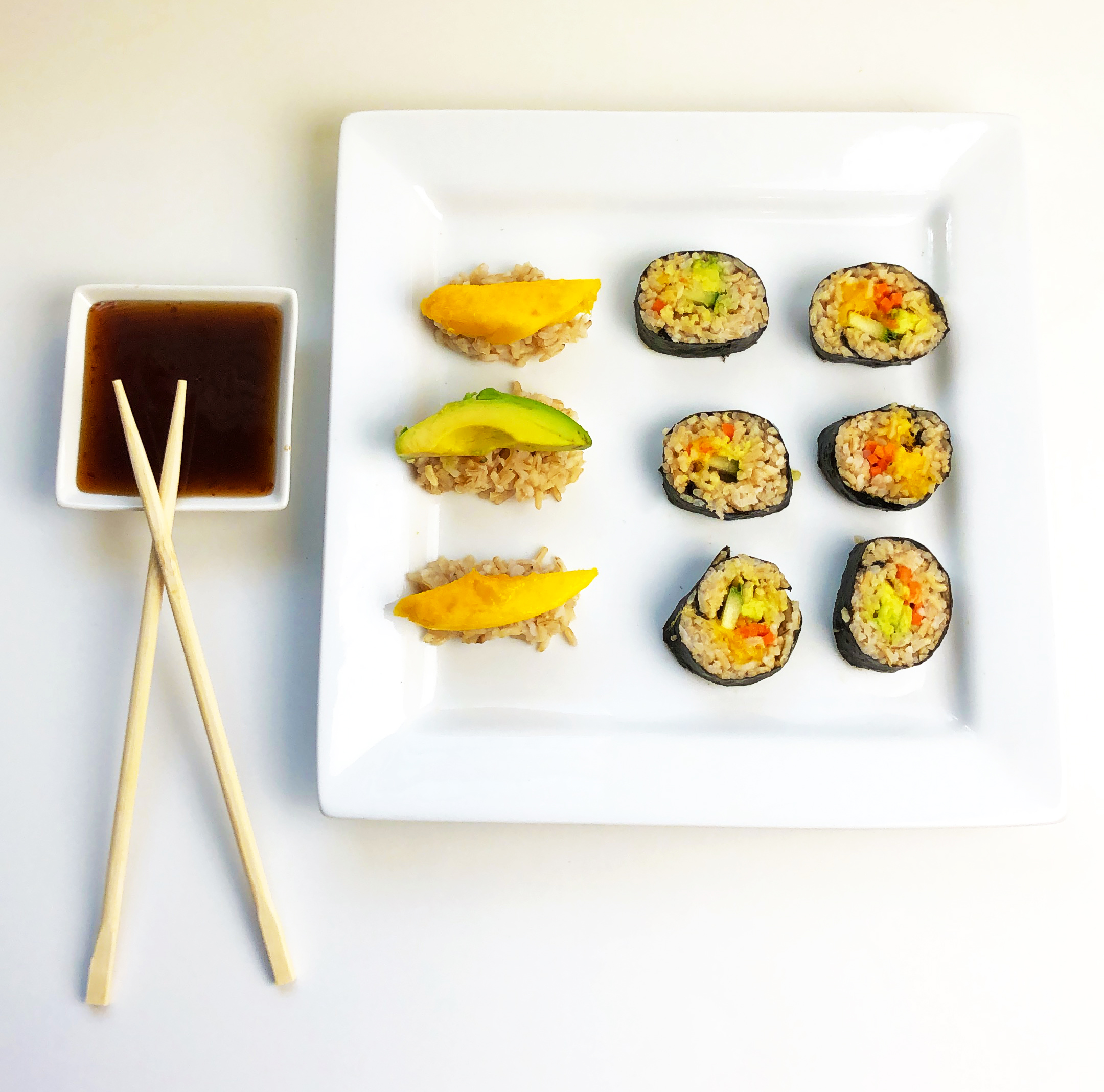 This vegan sushi is so good you wont even miss the fish (if that’s your thing). The mango texture gives this sushi recipe some fishy vibes without the raw fish! I love the tasty combination of the mango with the teriyaki sauce! I chose to use brown rice to make my sushi a little healthier. It’s harder to roll than traditional sushi rice, but I think it’s worth the extra effort. This dish is definitely healthy enough to be one of my weekly go-to meals. It’s quick, easy, fun, and a little different.